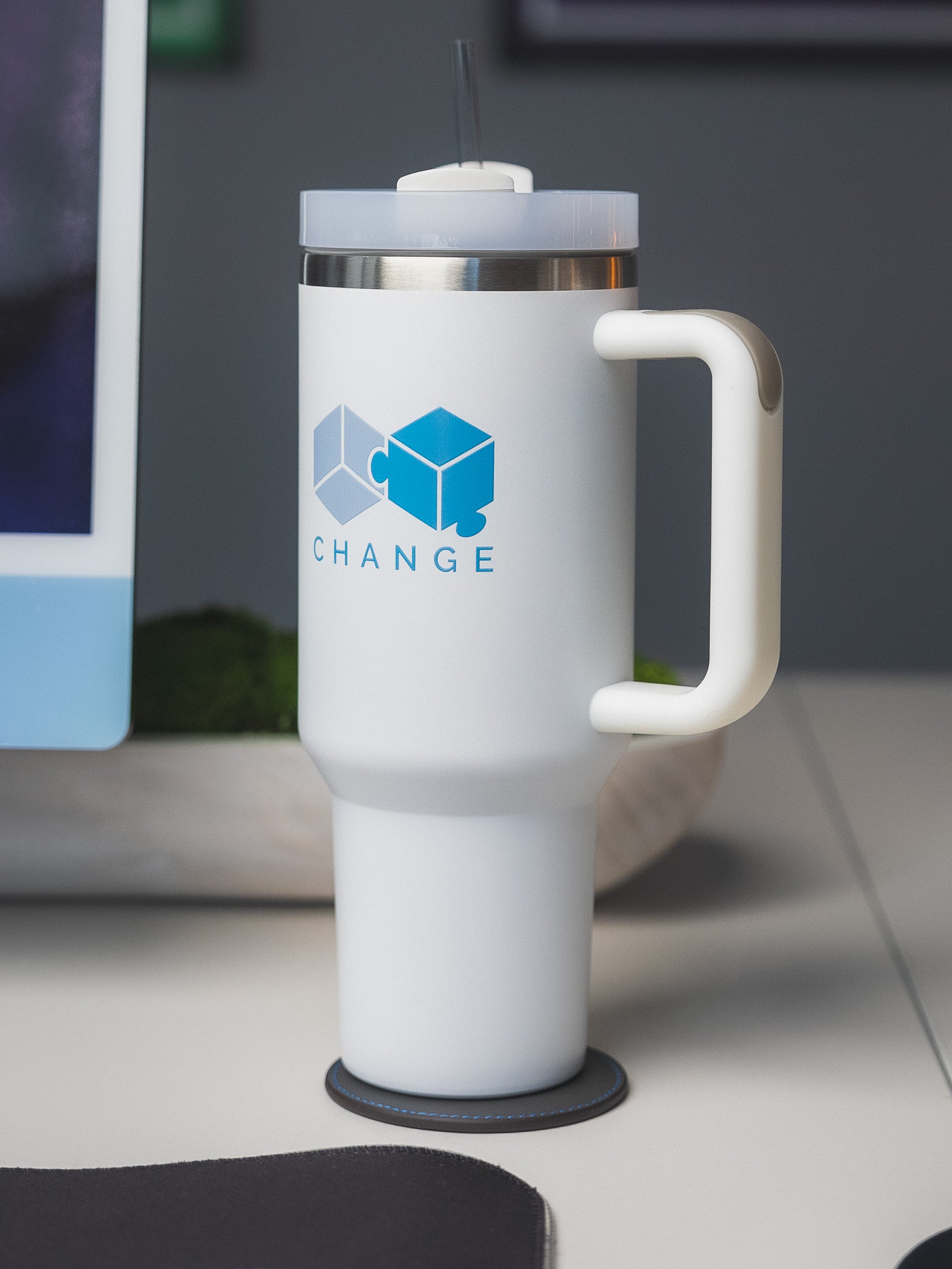 Keep your drinks at the perfect temperature with our stainless steel tumbler, featuring the Change logo. Whether it's hot coffee or an ice-cold refreshment, this durable, insulated tumbler is built for your daily grind.